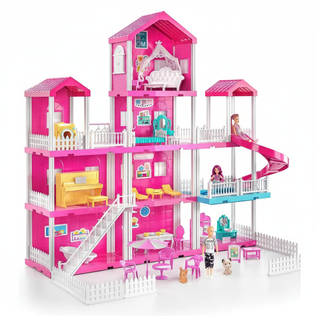Bring timeless elegance and imaginative play into your child’s playroom with the BelleMaison™ Dollhouse. Designed as a beautiful 4-story pink villa, this thoughtfully crafted playset invites children to create stories, explore role play, and enjoy hours of screen-free fun. With 10 detailed rooms, included dolls, and charming furniture pieces, BelleMaison™ offers a complete pretend play experience parents can feel good about.